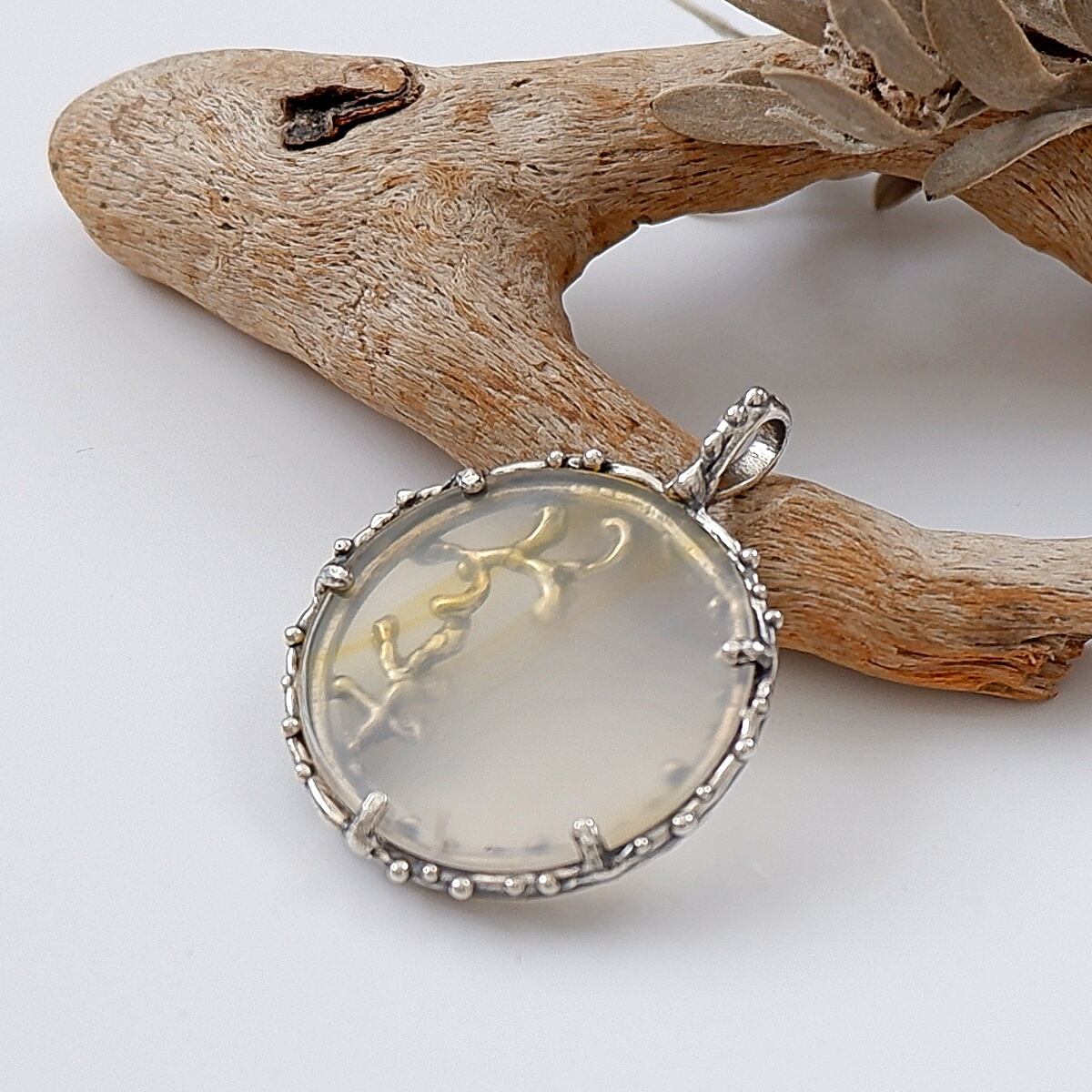 ほんのり黄色みがかったアゲート(瑪瑙)に現れた、繊細な縞模様を水の流れに見立てて、揺蕩う水草のような装飾をあしらい、ペンダントに仕立てました。
