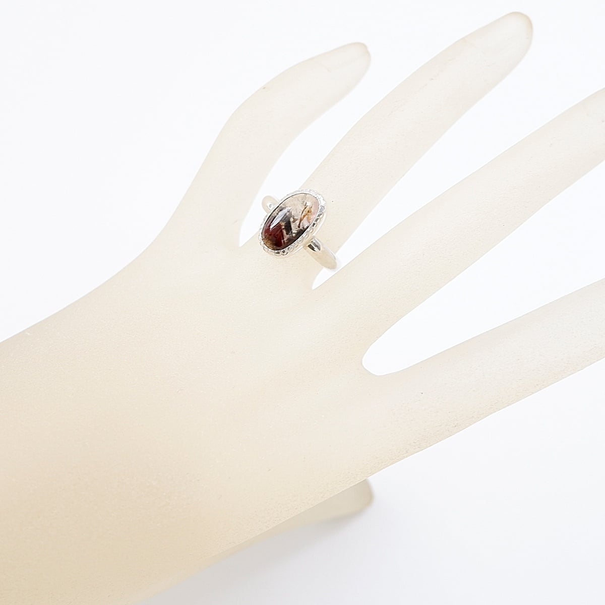 水晶にヘマタイトやゲーサイト、カコクセナイトを内包したルースを使用し、シンプルな甲丸線を使ったリングに仕上げました。
