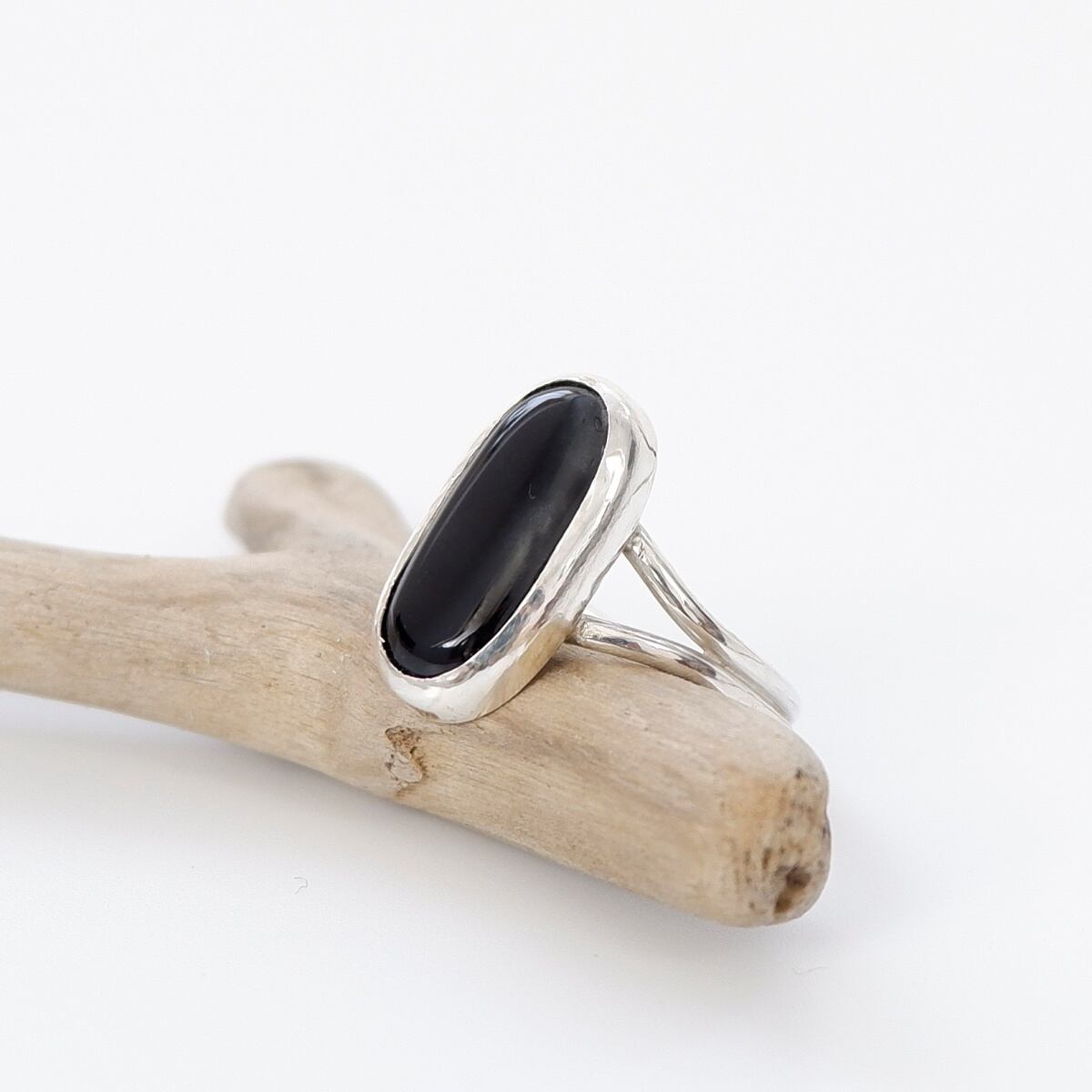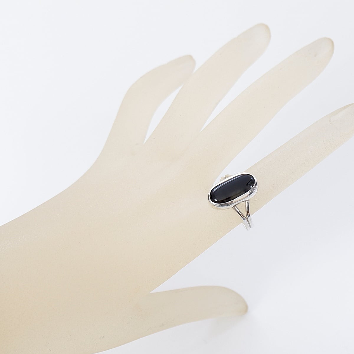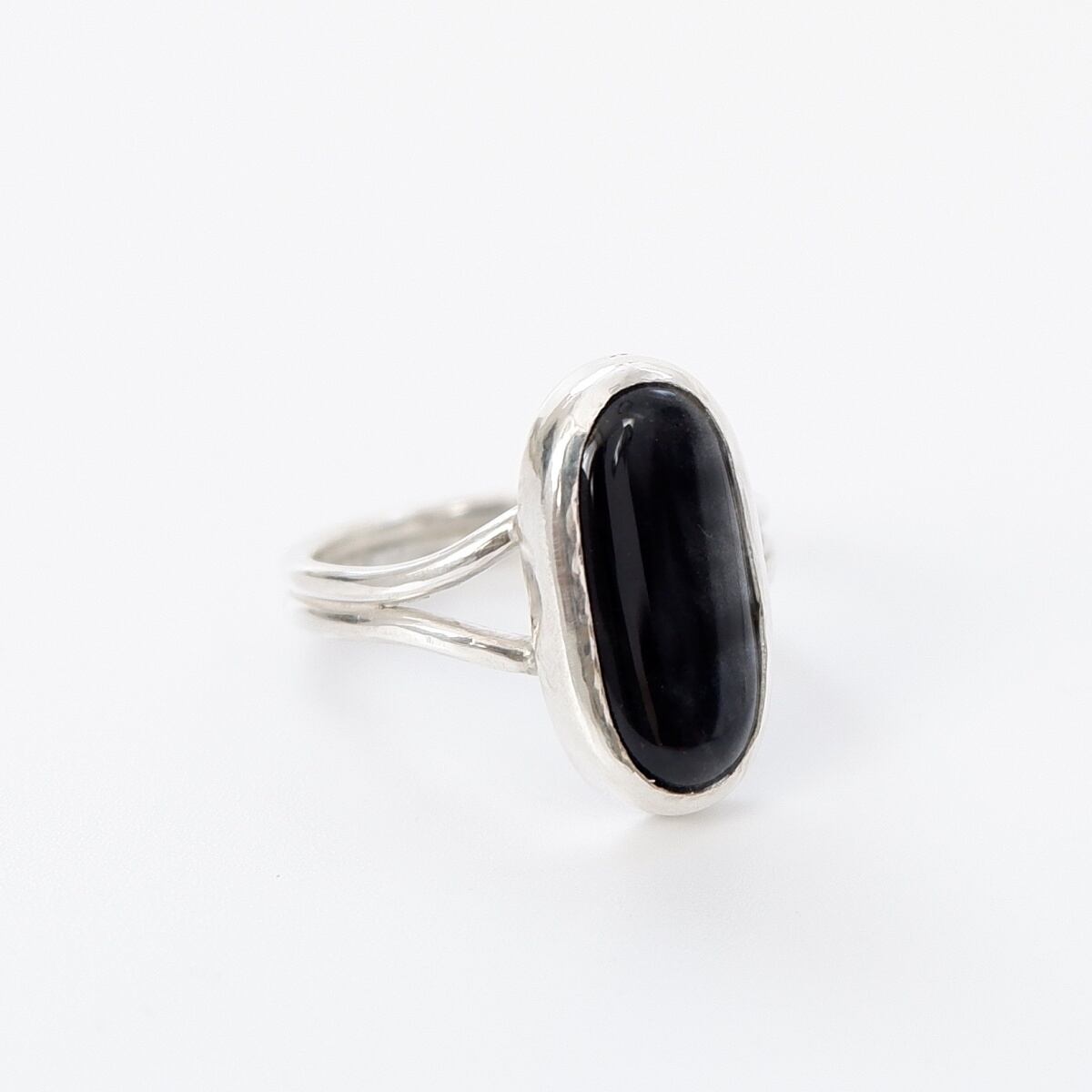 艶やかな漆黒が美しい石を、シンプルなアームのリングに留めてみました。