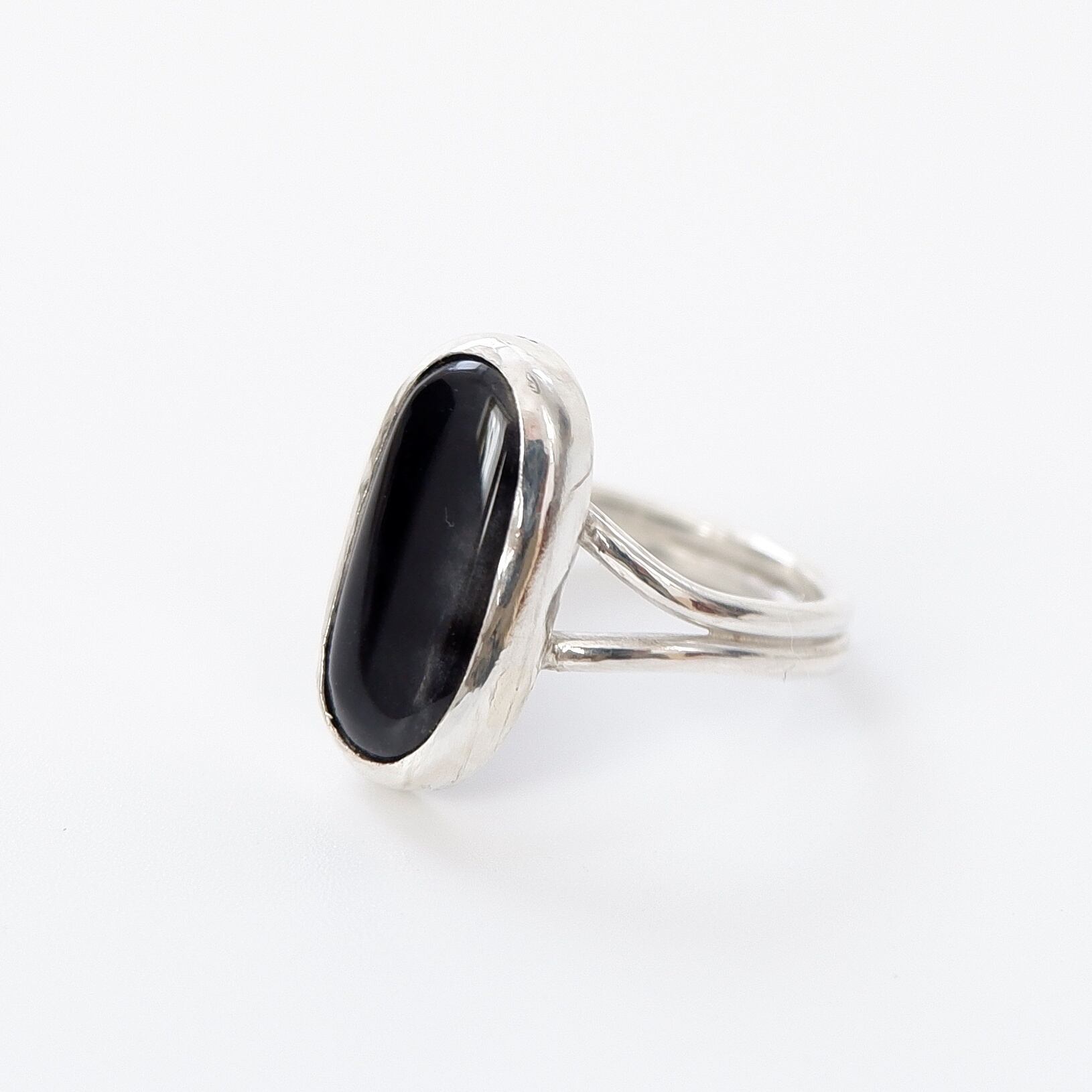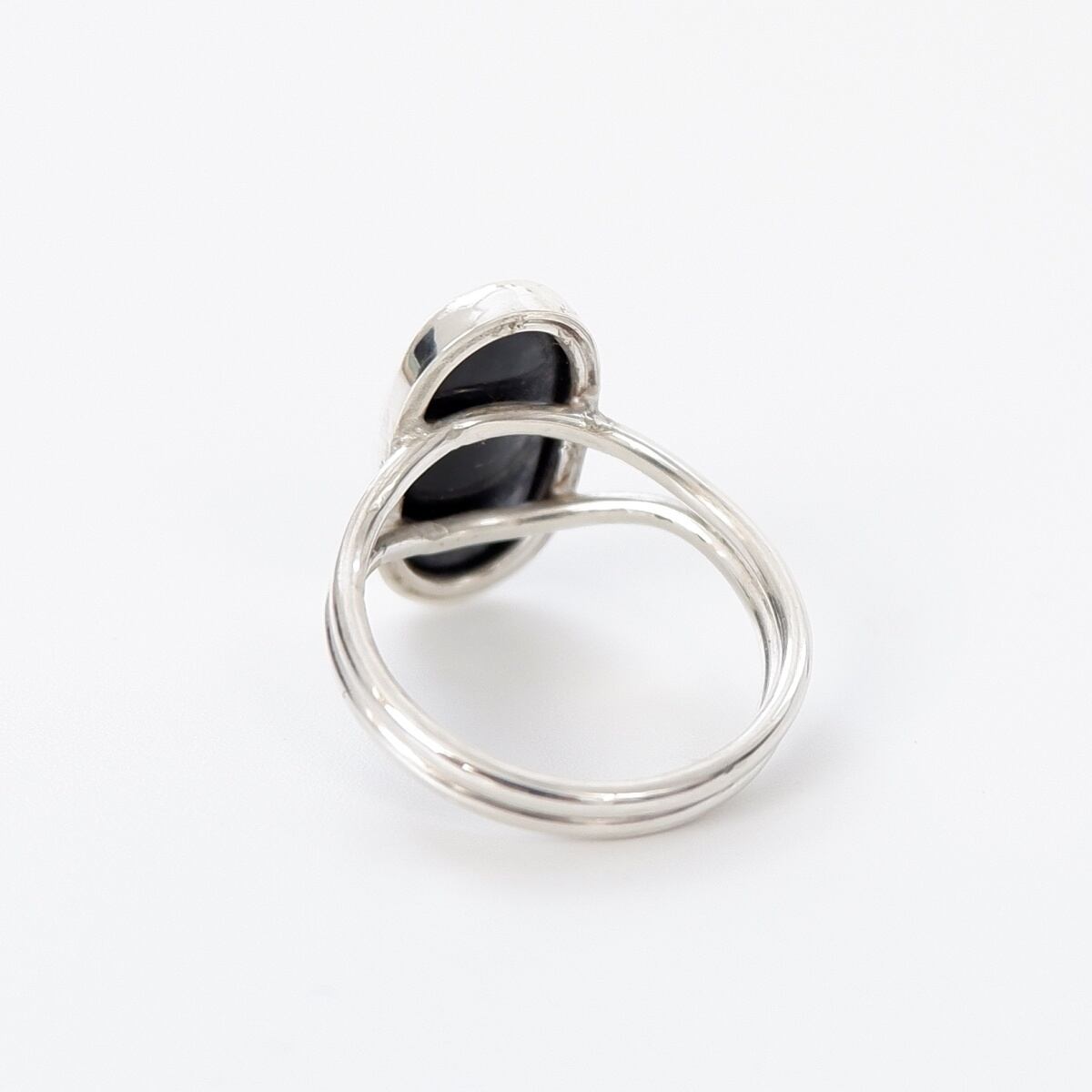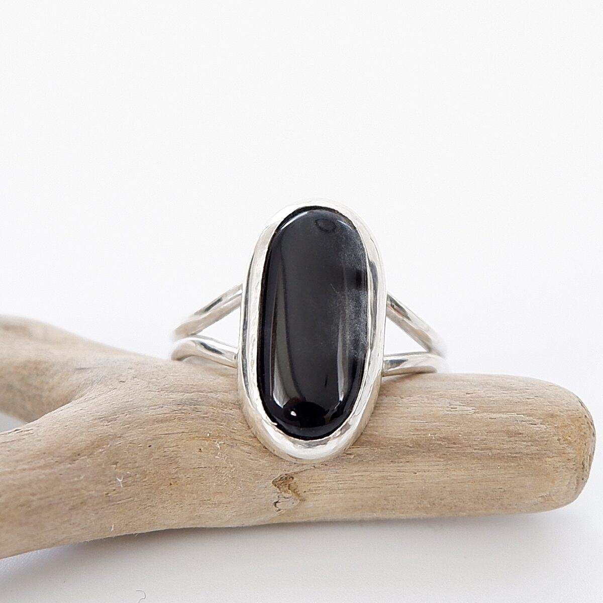 艶やかな漆黒が美しい石を、シンプルなアームのリングに留めてみました。