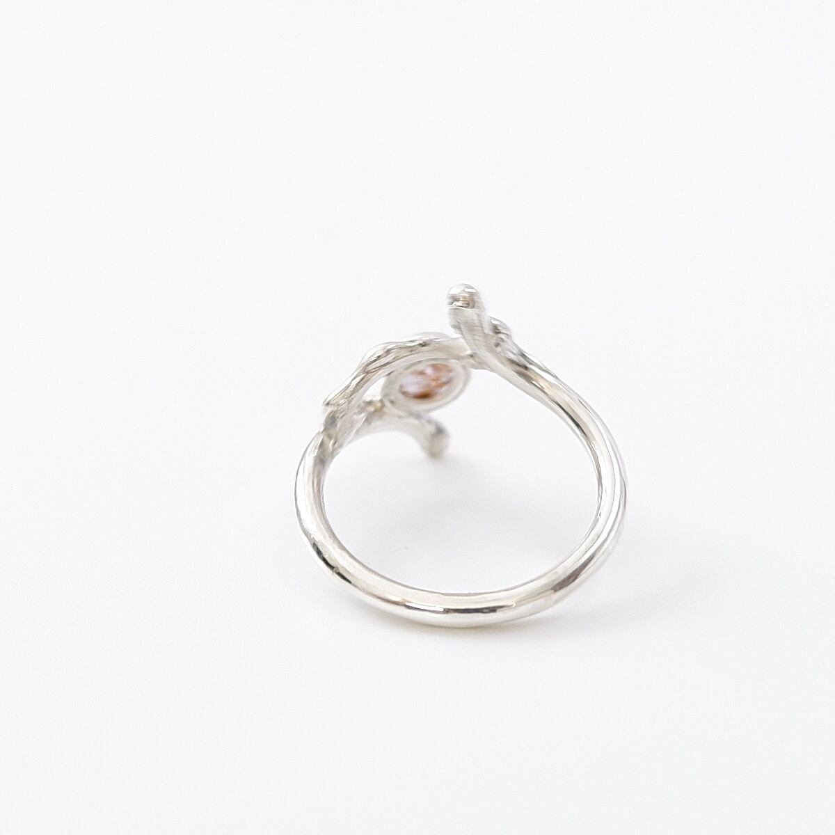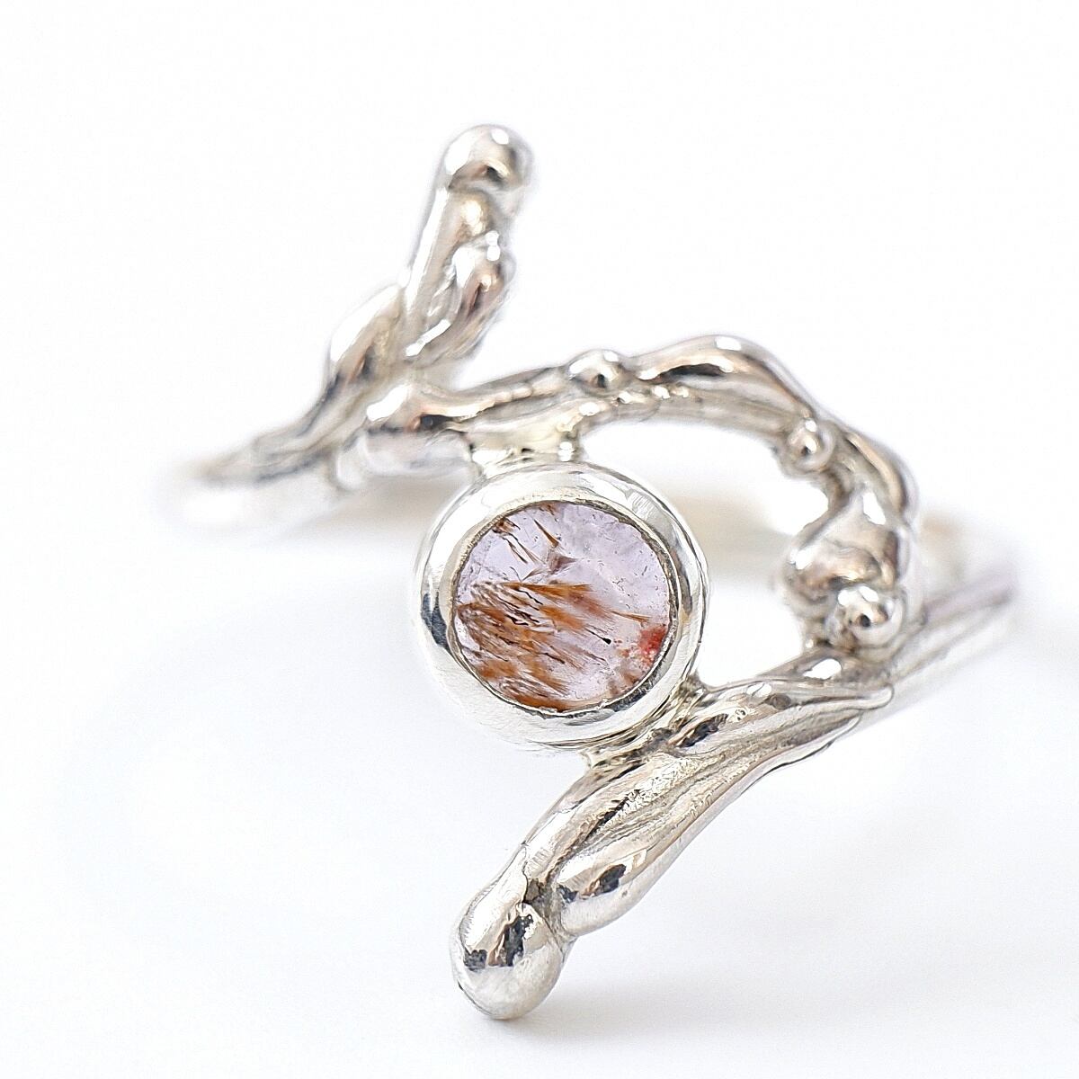 淡い紫色のアメジストの中に金色のカコクセナイトを内包した小さなルースを、有機的な流線型のデザインリングに仕上げました。