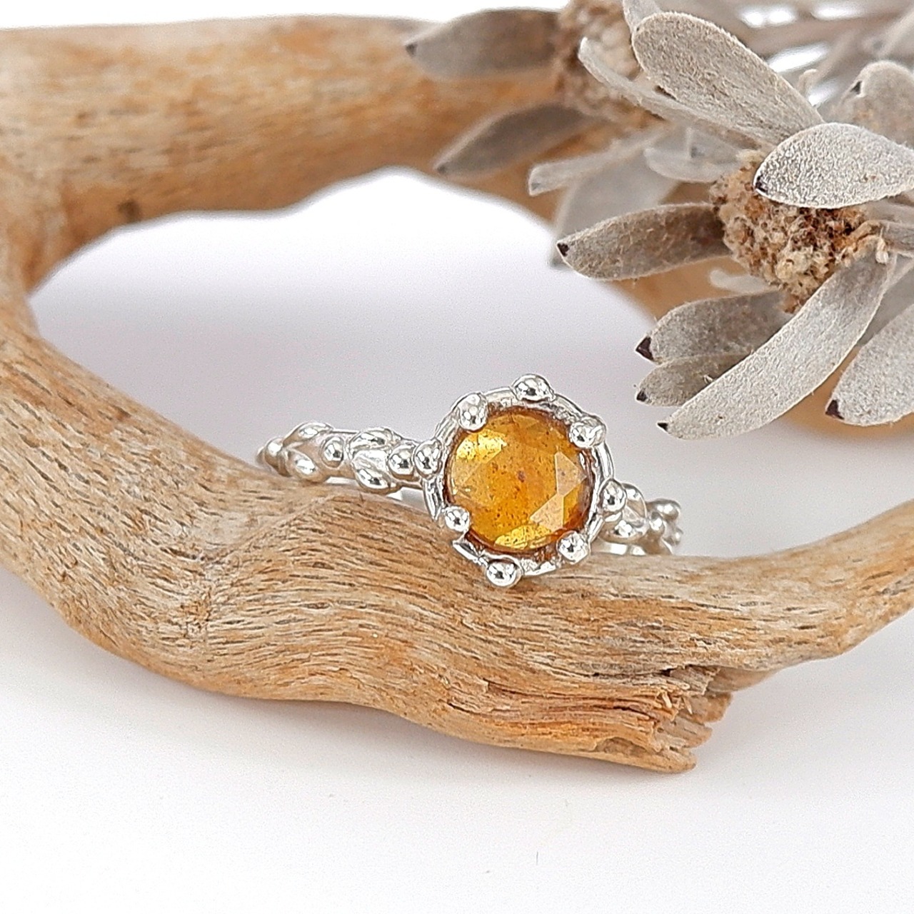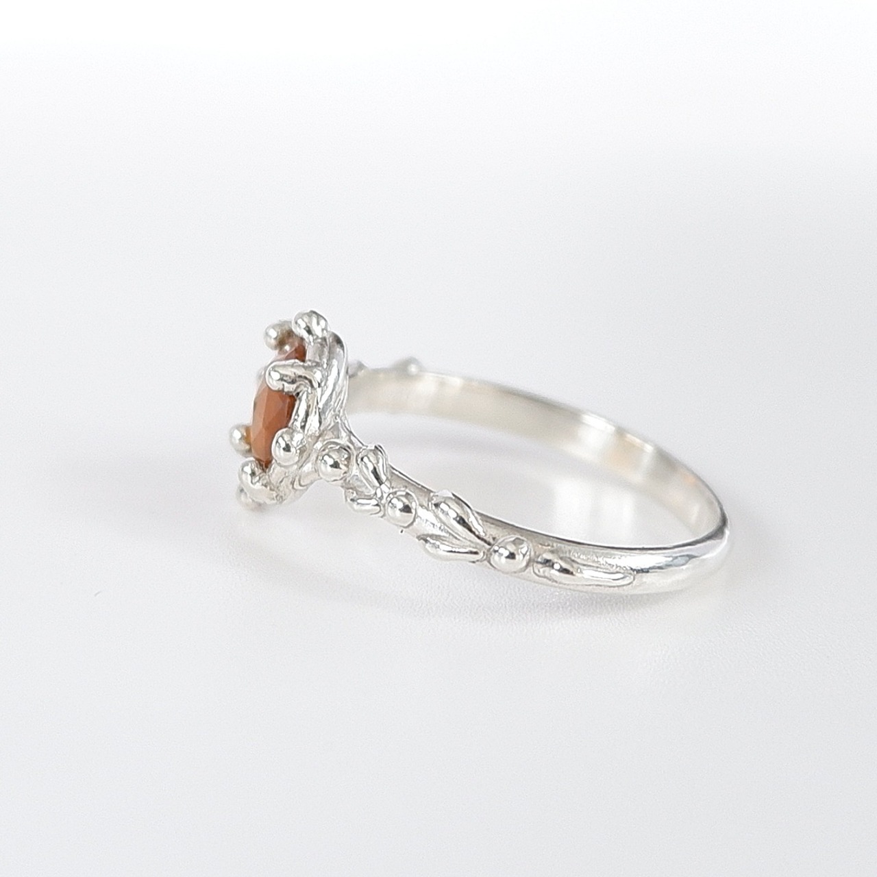 落ち着いたオレンジカラーのカイヤナイトを、アームに粒飾りをあしらった華奢なリングに仕上げました。