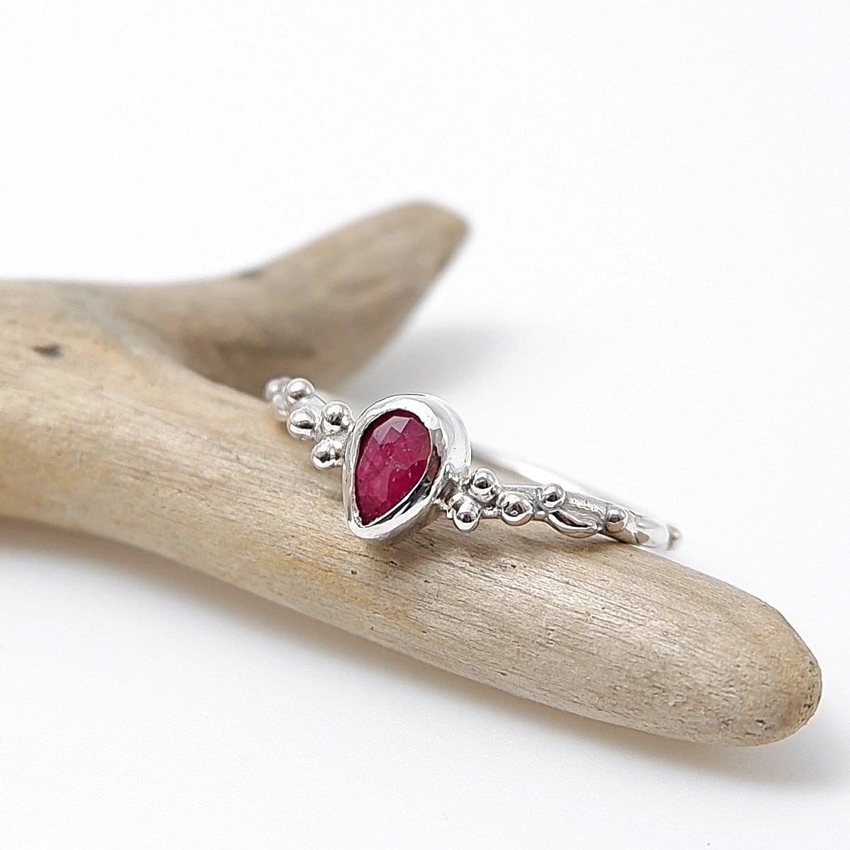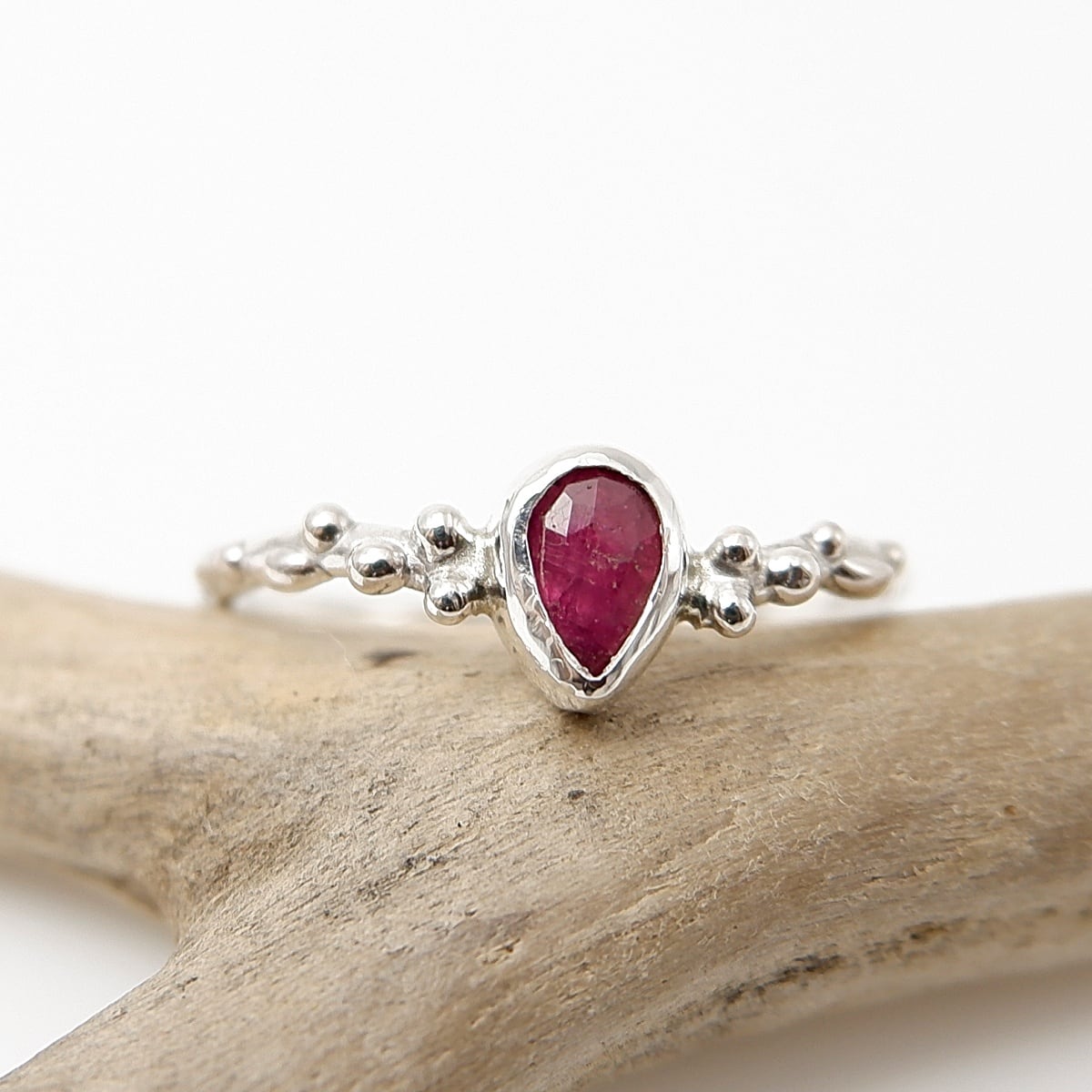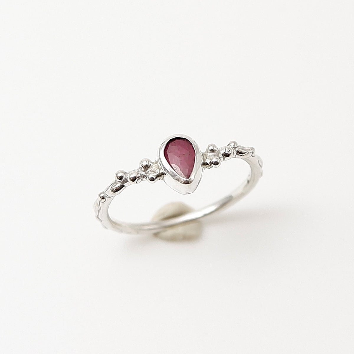 華奢な粒飾りのシルバーリングに留められたこのルビーは、日常使いにもぴったり。