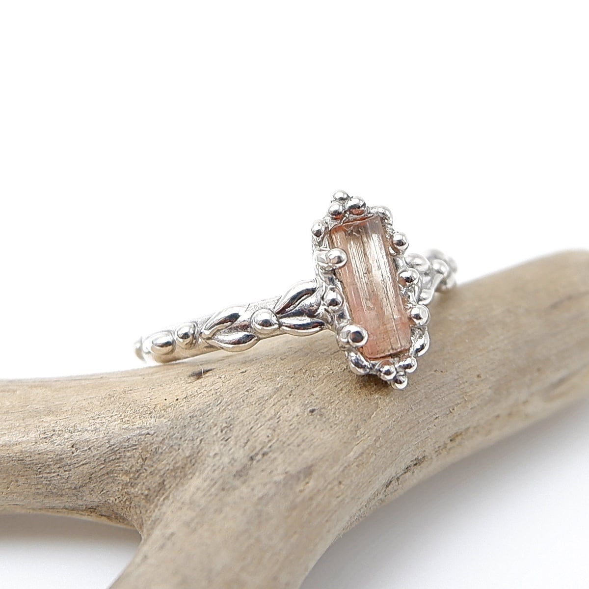 淡いピンク色のトルマリン原石をあしらった、繊細な粒飾りのリングです。