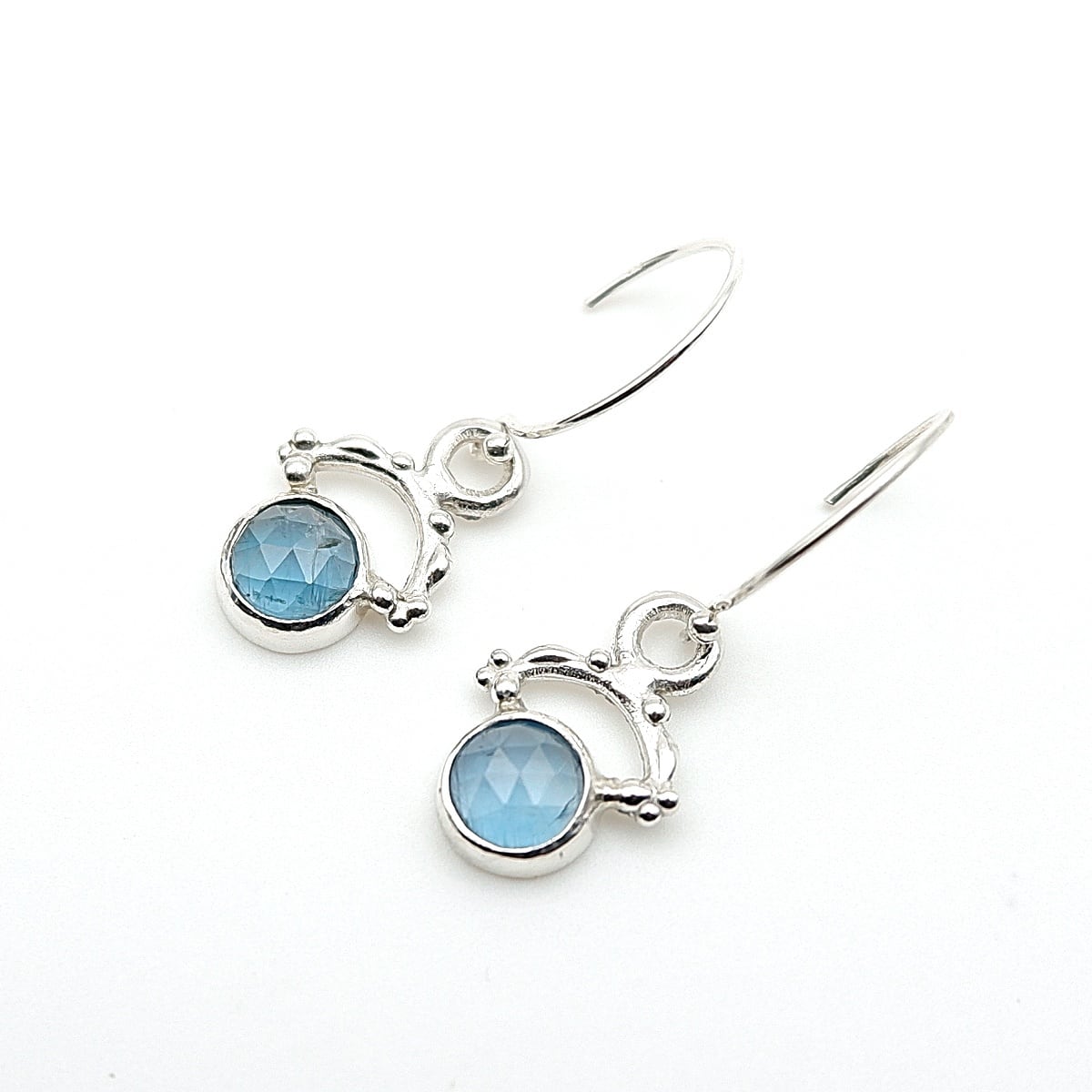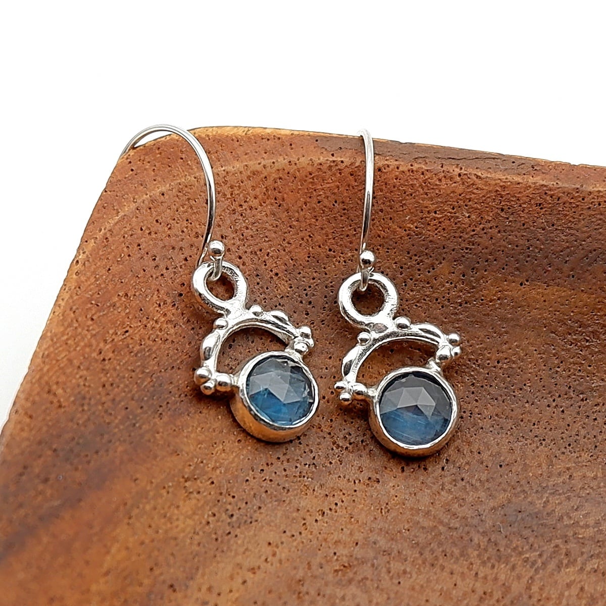 ネオンブルーが美しいカイヤナイトに、さりげなく愛らしい粒飾りを添え、上品なピアスに仕上げました。