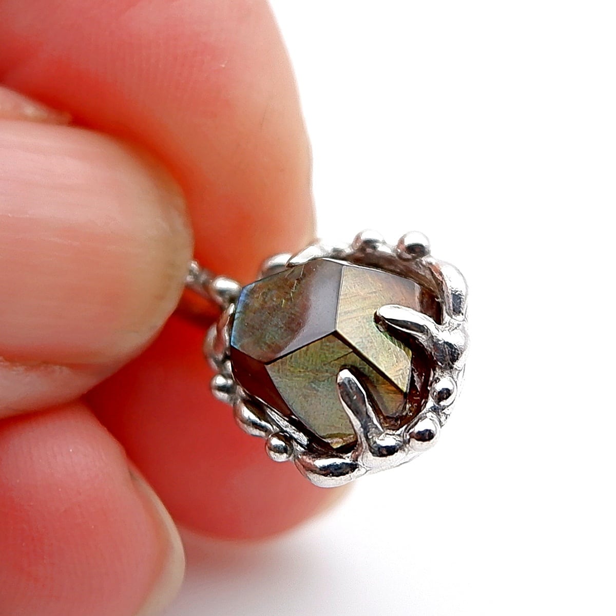 原石由来の形を生かし、石の輪郭に沿うように配した粒装飾が、全体をやさしく包み込んでいます。