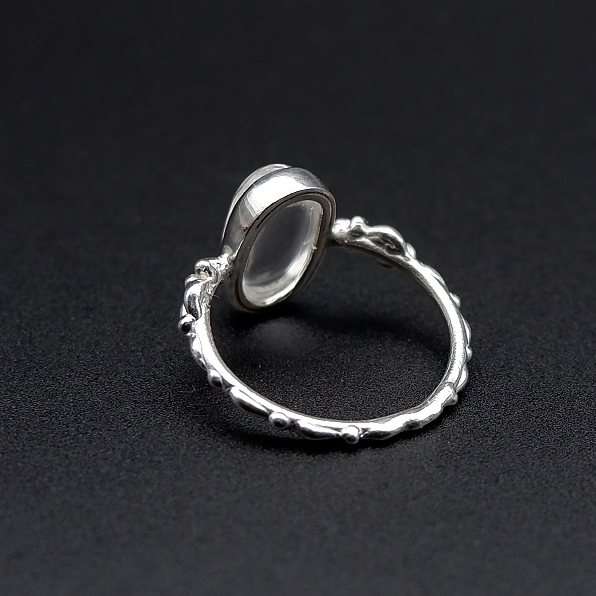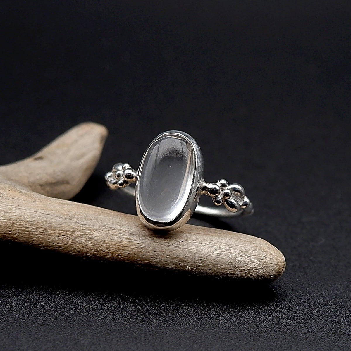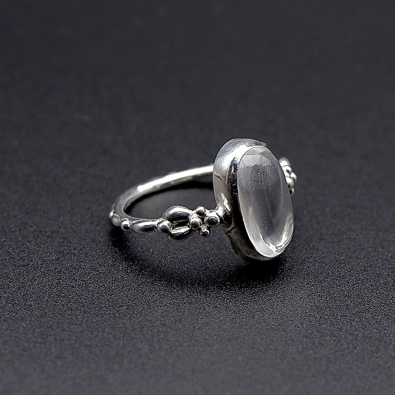 山梨県にある乙女鉱山で産出された水晶を磨き、アームに粒飾りを添えたリングに仕立てました。