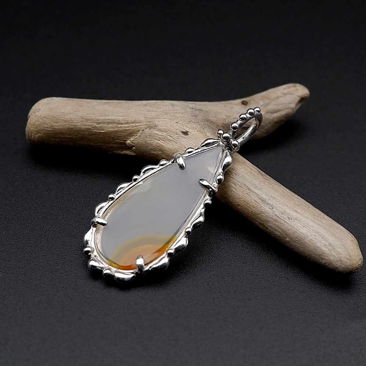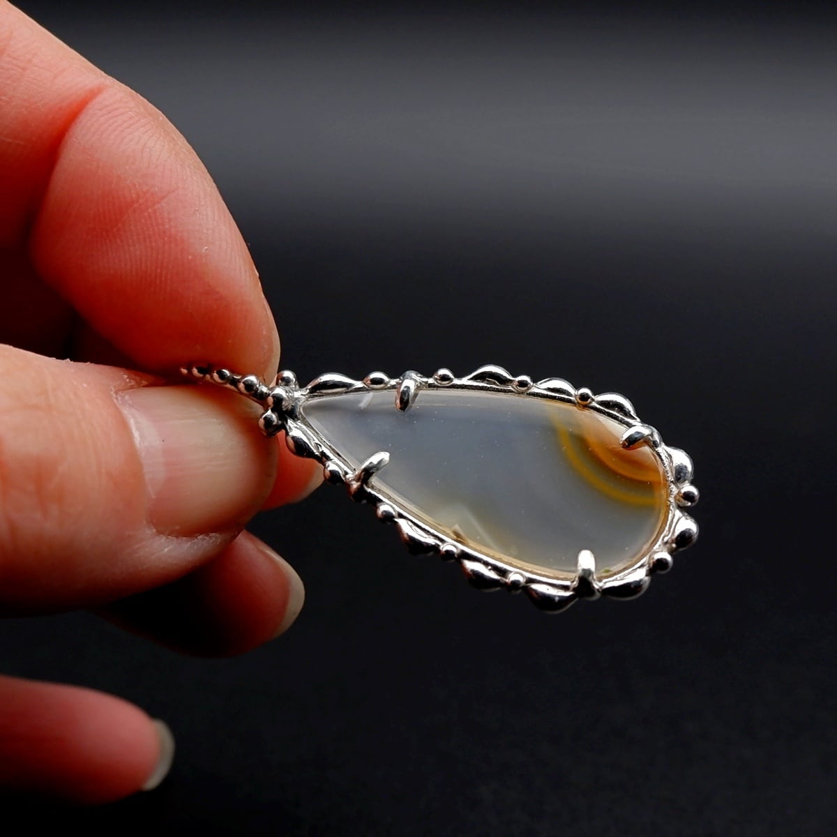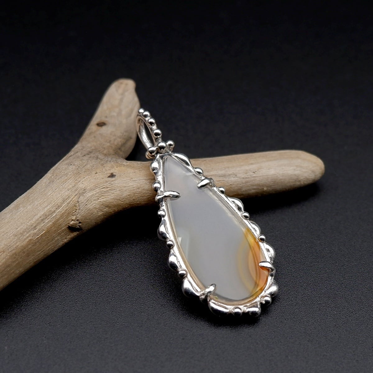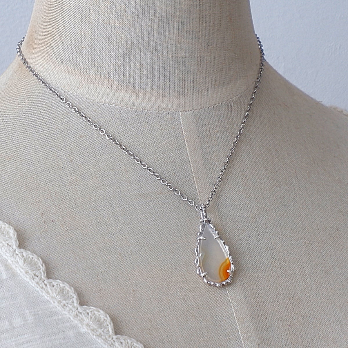ホワイトを基調とした地色に、オレンジ色の模様が差し込んだイリスアゲートを、シルバーの粒飾りが愛らしいペンダントに仕立てました。