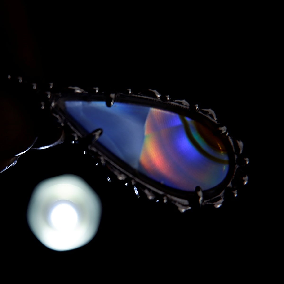 黒い物の上に置き、強めの光を当てると、翳さなくてもぼんやりと虹色の輝きが感じられる場合があります。