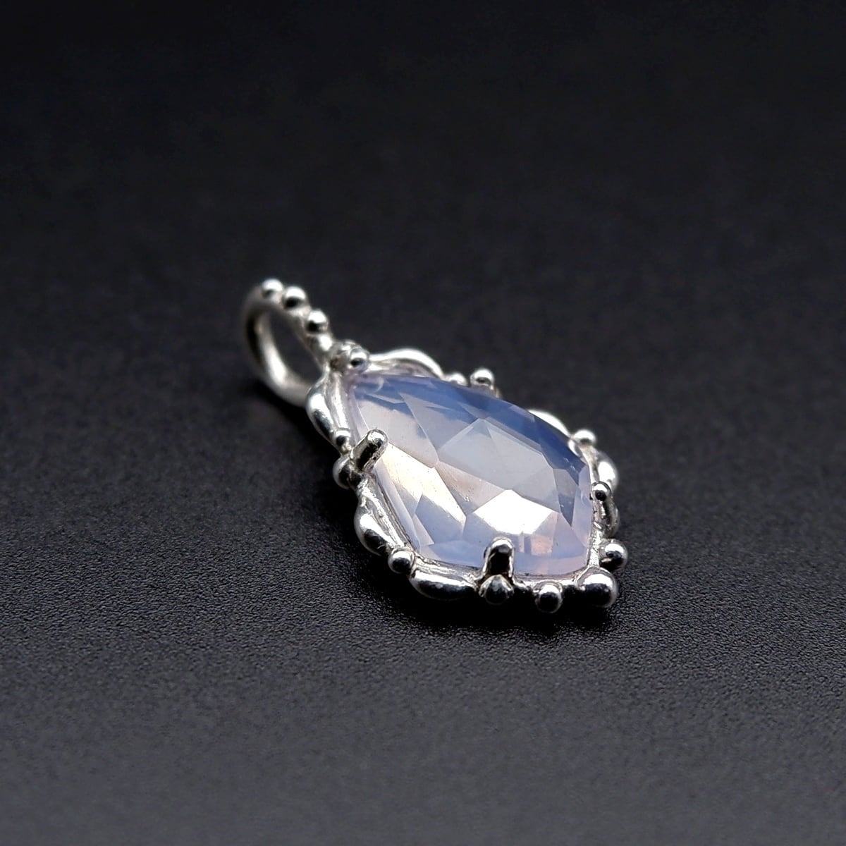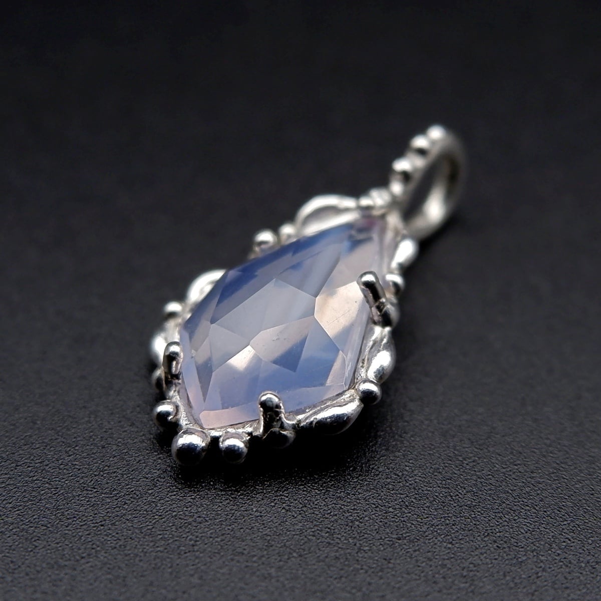 透明感のあるローズクォーツに青みを足したような、不思議な色合いが美しいラベンダークォーツを粒飾りのペンダントに仕上げました。