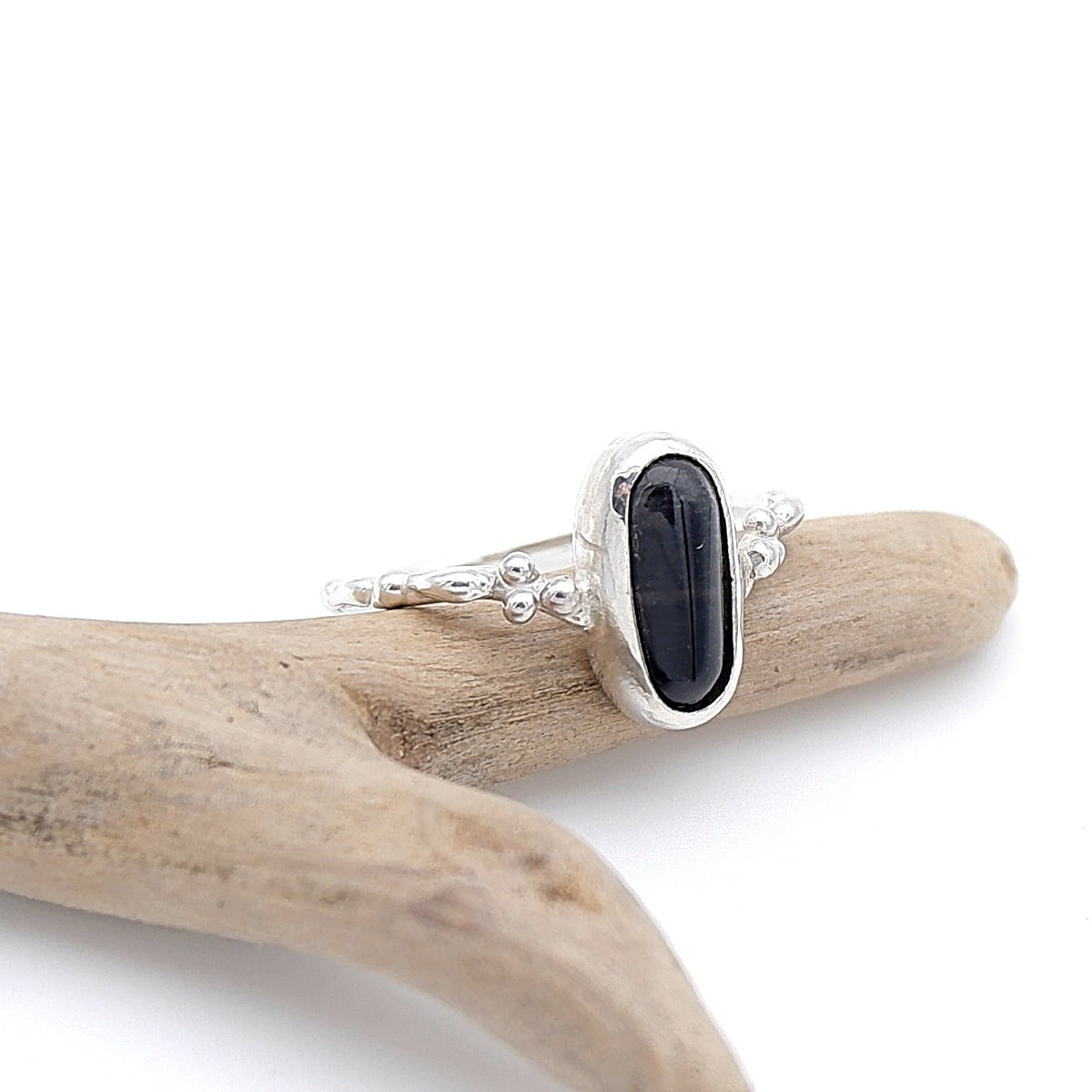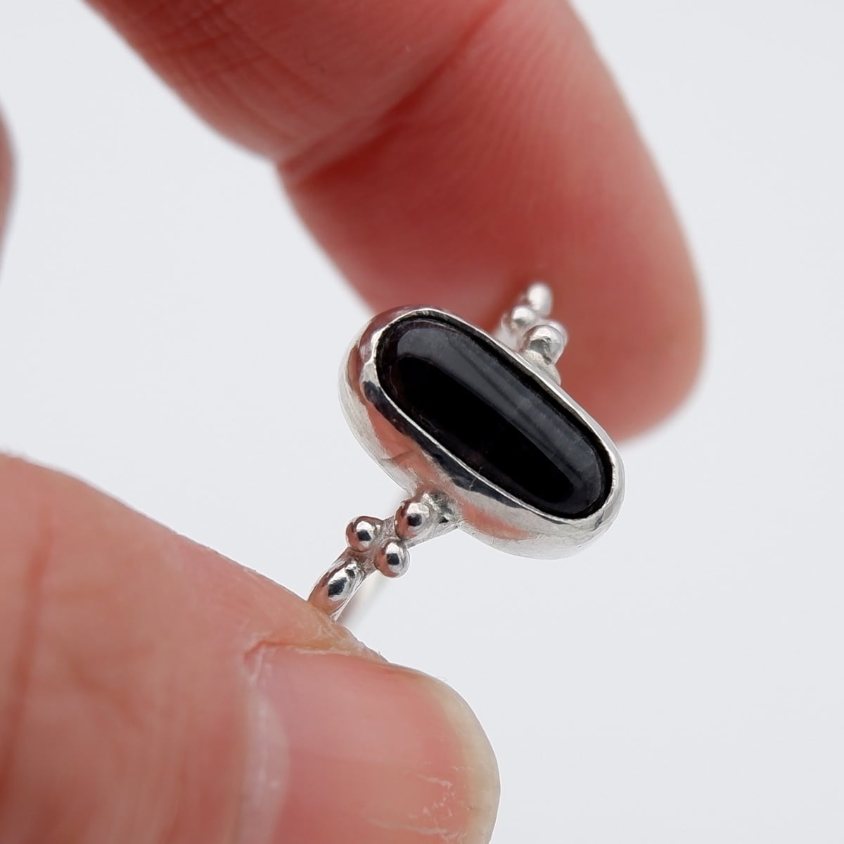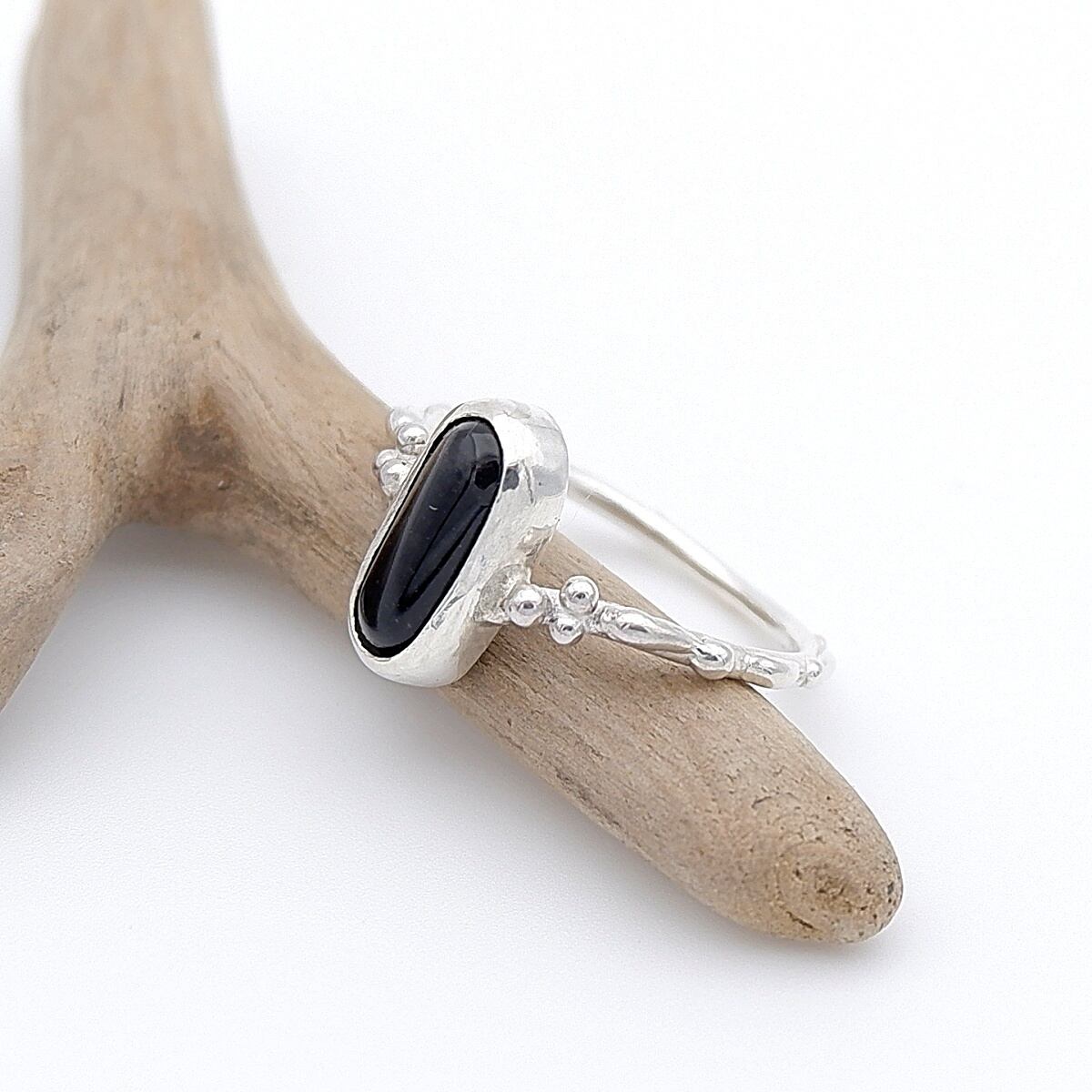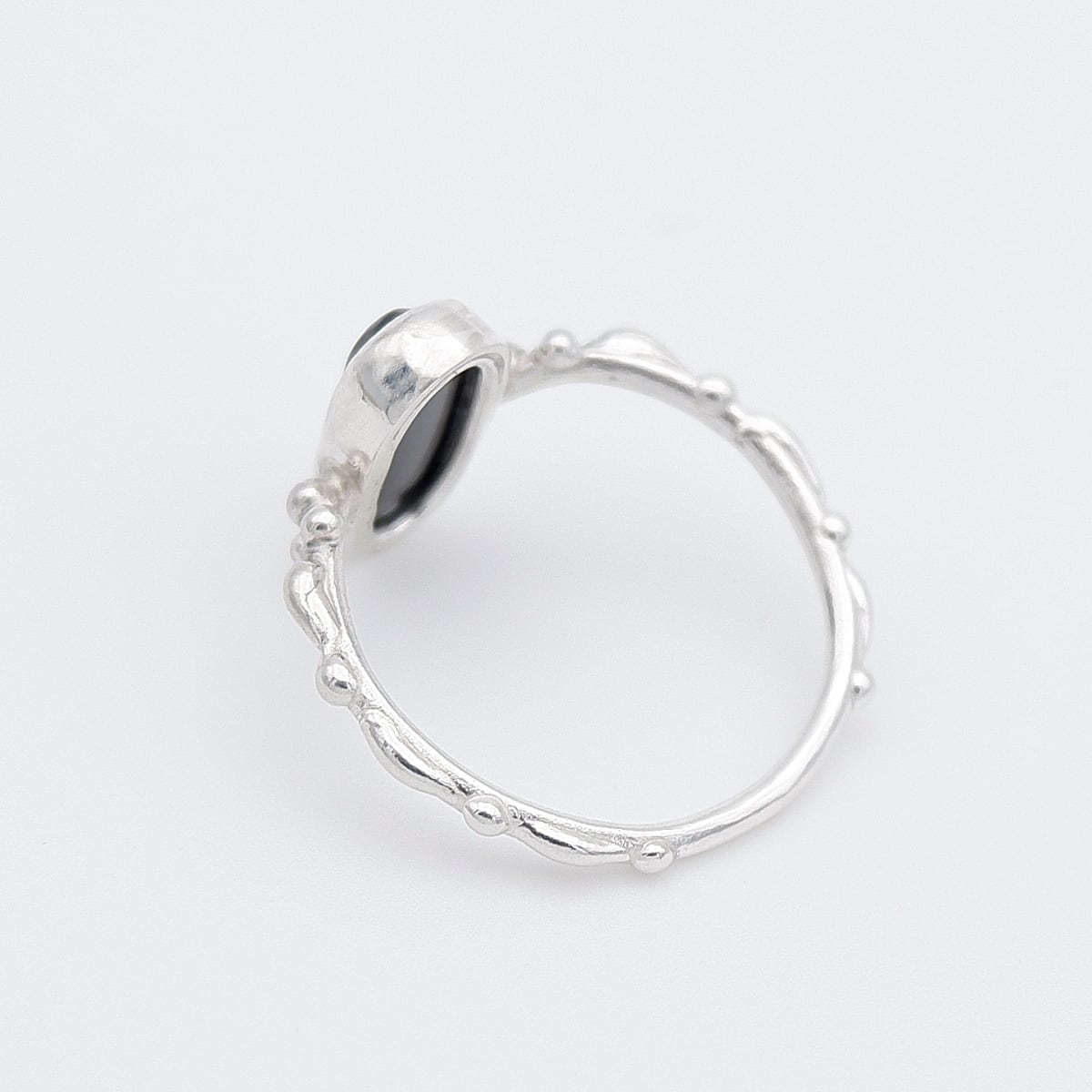 艶やかな漆黒の輝きが美しい石を、アームに粒飾りを添えたクラシカルなリングに仕立てています。