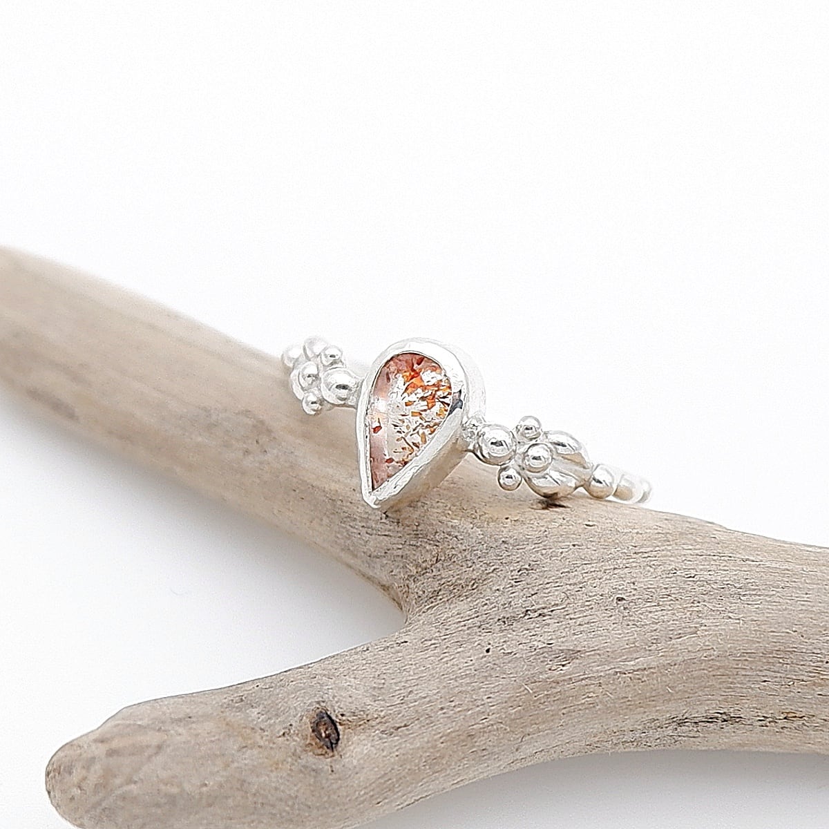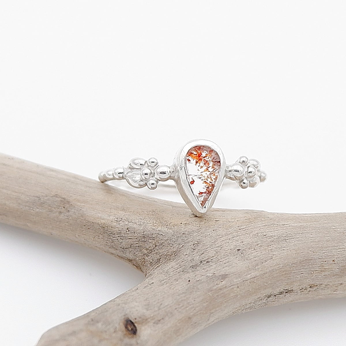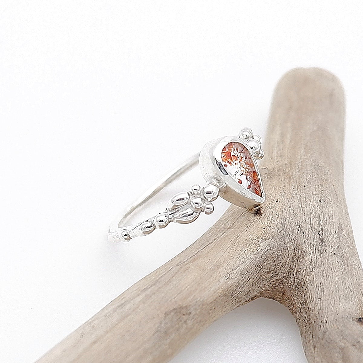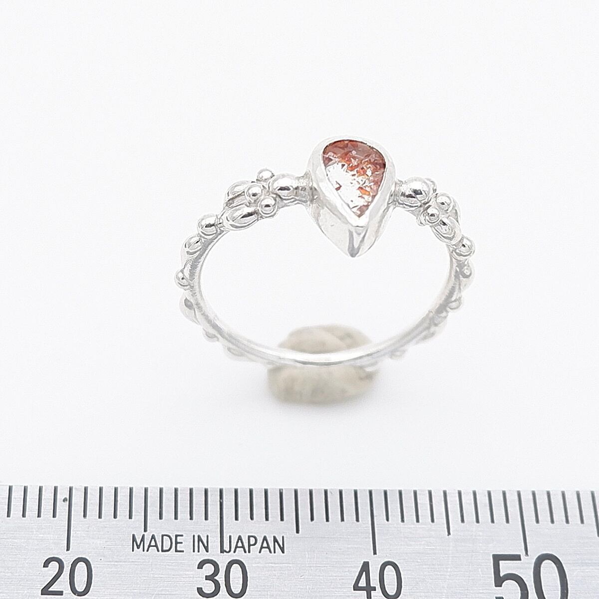 赤っぽいレピドクロサイト(鱗鉄鉱)を内包した小粒の水晶を、アームに粒飾りをつけた華奢で可愛らしいリングに仕上げました。