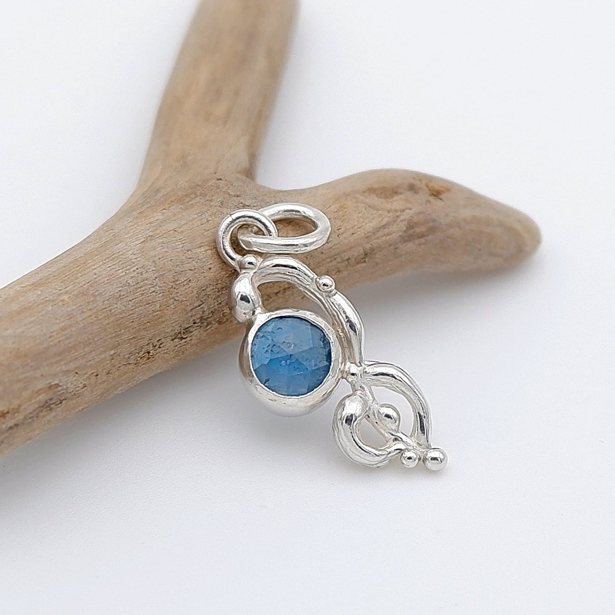 透明感のあるネオンブルーのカイヤナイトを、植物のような不思議なデザインのペンダントに仕上げました。