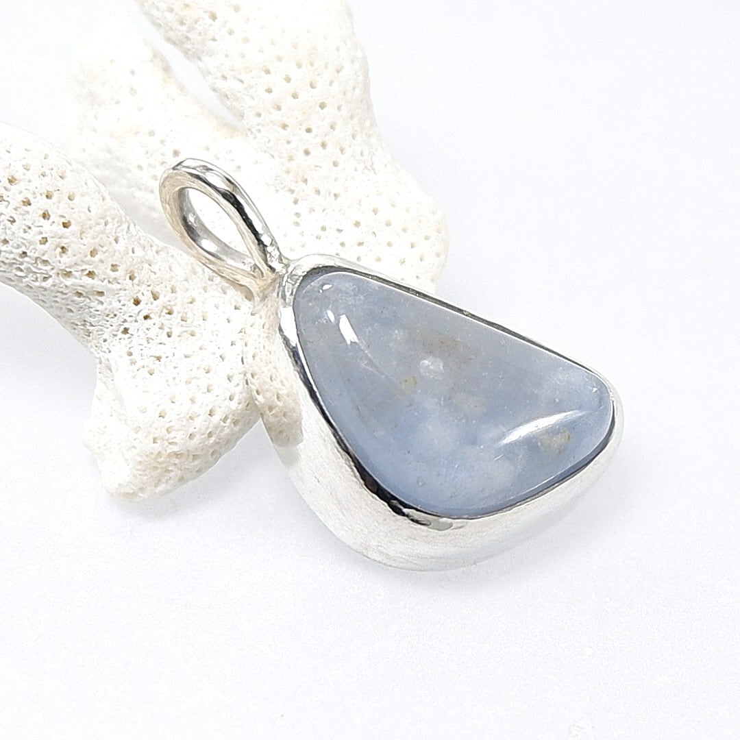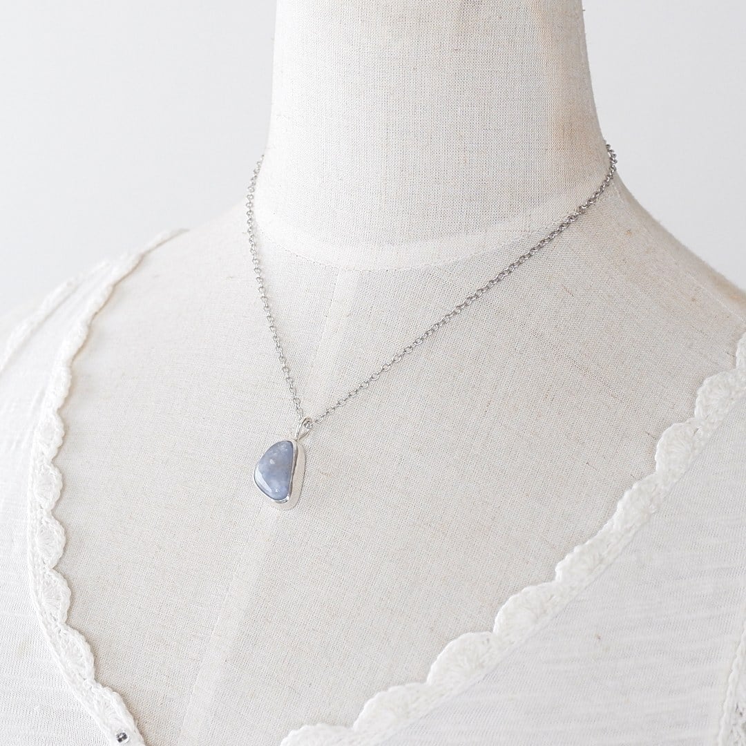 水晶に淡いブルーのデュモルチェライトを内包したレアストーンを、シンプルなペンダントに仕上げました。